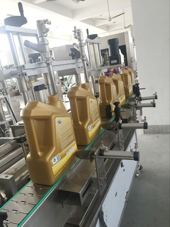 設備描述:潤滑油灌裝旋蓋一體機為活塞式計量方式。計量范圍為1升-5升,離合式旋蓋結構,確保旋蓋合格率高,不傷蓋。本設備為灌裝旋蓋一體機,結構緊湊,性價比高。該型號灌裝機適用于醫藥、日化、食品、農藥及特殊行業,是對酒精等液體進行灌裝的理想設備。