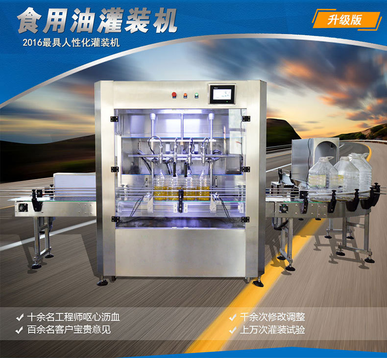 產品簡介:全自動玉米油灌裝機是全自動油類灌裝設備中比較特殊的一種,是根據玉米油的的特殊品質而量身打造的專門用來灌裝玉米油類產品的全自動灌裝機械。該設備采用先進的定量灌裝技術,將微電子智能控制技術與程序控制應用于本灌裝機,使之成為機電一體化的新型產品。